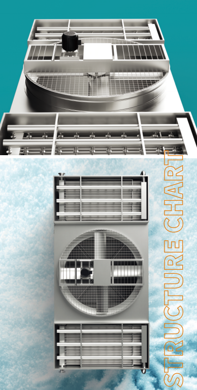 1 .双冷却管束, 两侧进风设计, 进风更高效, 冷凝器更稳定。