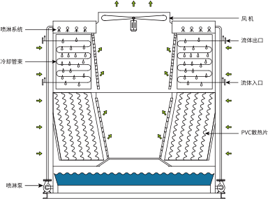 FBH产品运用了风水同向横流式二次热交换的管束与PVC填料组合 的技术, 实现了高效换热。 由于空气和喷淋水同向流经管束, 喷淋水能较大程度地覆盖在管束表面, 保证管束表面完全湿润。 相比风水逆向 的结构, 大大减少了管束壁干点和水垢的形成。